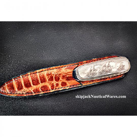 Scrimshawed letter opener featuring three sailing ships racing under full sail, black and white scrimshaw on an oval bone handle with highly polished steel rope surround, created by the late Sam McDowell. The backside of the steel blade is engraved "COLLECTOR KNIVES BY SAM MCDOWELL" in the center and "SAKI-CITY JAPAN" at the bottom. The scrimshawed handle is a fine example of McDowell's artwork. The paper knife or letter opener measures 6/8 of an inch wide and 6 inches in length. The knife comes with a hand-sewn leather (alligator skin style) sheath.